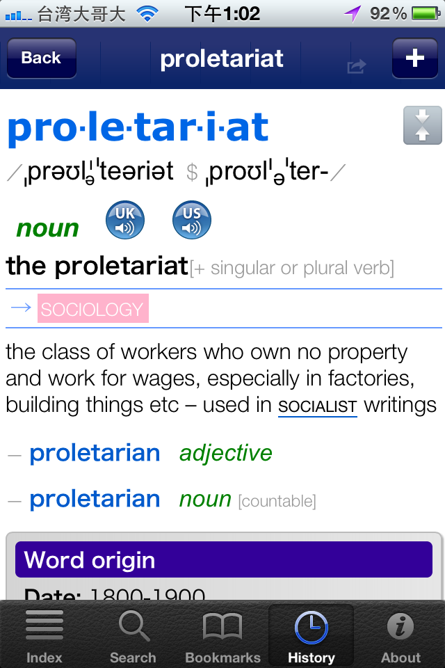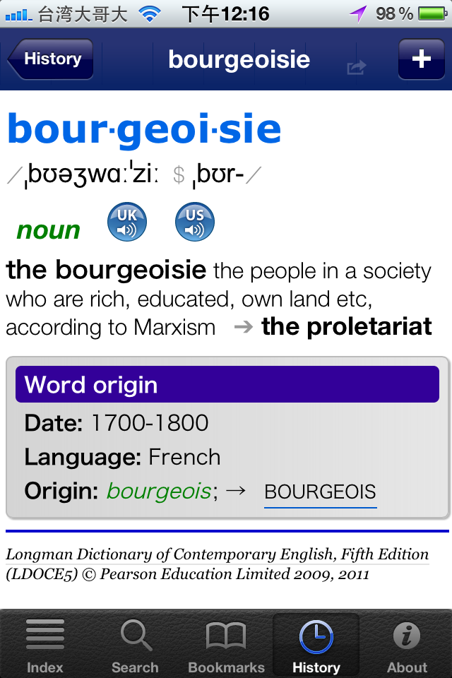 LDOCE Plus 裏頭的書籤功能,非常好用,以查詢「bourgeoisie」 這個字來舉例: