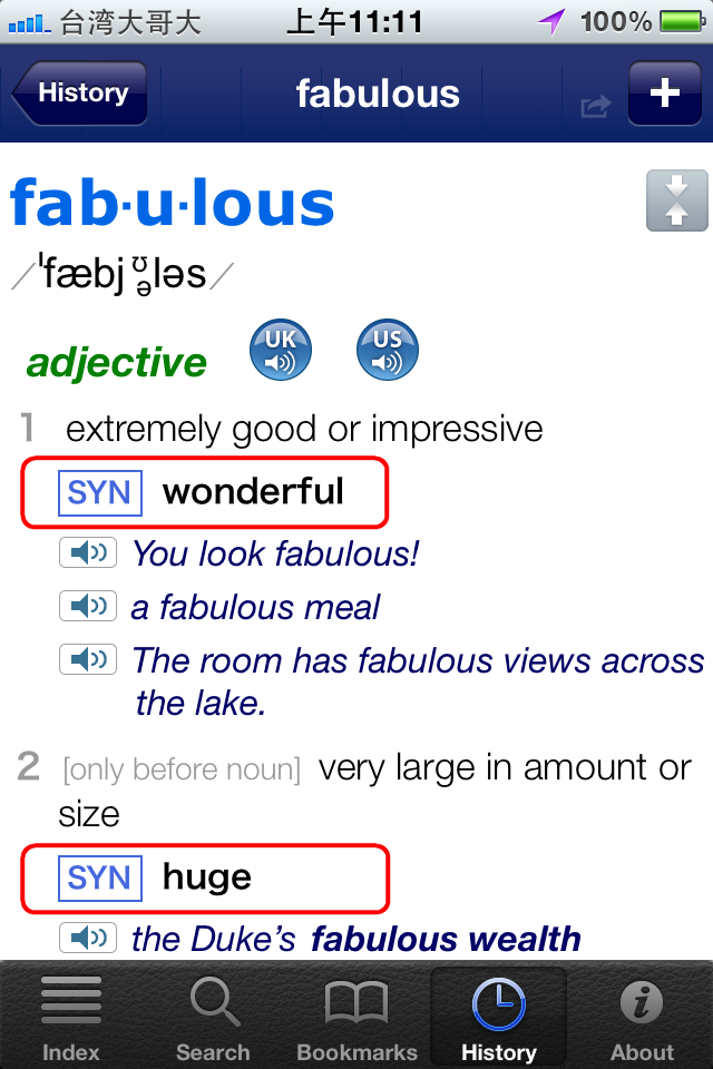 當然,同義字的部份,LDOCE Plus 這套字典也一樣有列,例如,查詢「fabulous」這個字,在下圖中,就可以看到紅色框框標示,「根據不同的字義」,字典會列出對應的同義字,這樣的編排內容,真的很專業: